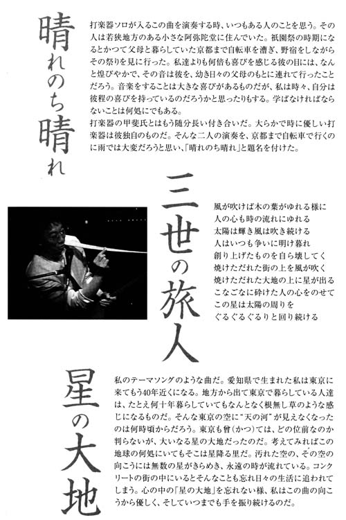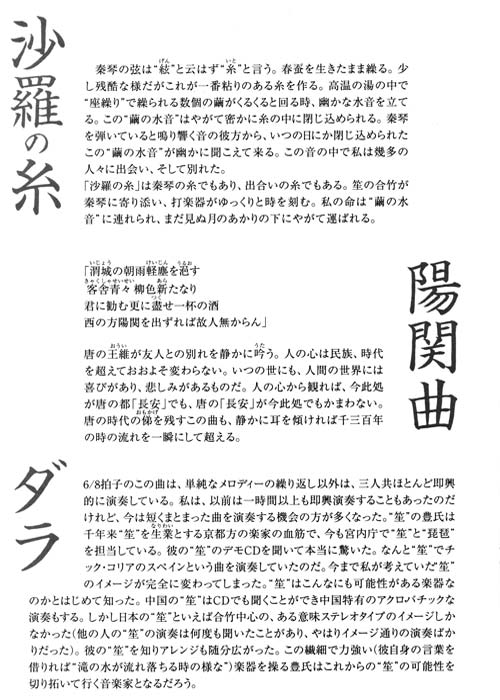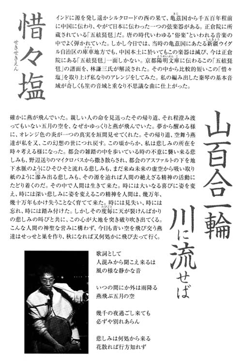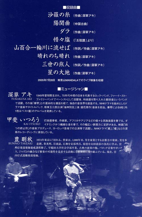 中国古代、漢の時代に現れた絃楽器を源流に持ち、二千数百年の歴史を持つとも言われるこの楽器は、現在の中国には専門に演奏する人はなく、民間音楽のごく一部で使われているにすぎない。そんな秦琴に魅せられ、独特のサウンドを追求し続けている深草アキが、2005年7月28日・南青山MANDALAで行ったライブの模様をDVD化。パーカッションの甲斐いつろう、笙・竿の豊剛秋をゲストに迎え、アジアの楽器による見事なコラボレーションが実現。楽曲もベスト盤「妙音希聲」に収録された親しみやすい楽曲を中心に取り上げており、古代アジアのロマン溢れる、エイジアン・ヒーリングの世界に、どっぷりと浸ることが出来る。