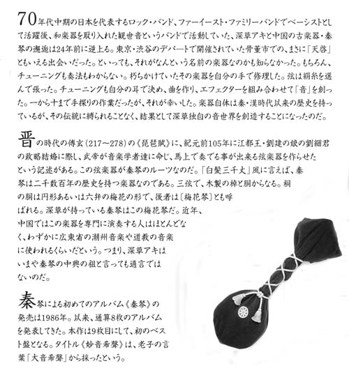 秦琴による初めてのアルバム《秦琴》の発売は1986年。以来、通算8枚のアルバムを発表してきた。本作は9枚目にして、初のべスト盤となる。タイトル《妙音希聲》は、老子の言葉「大音希聲」から採ったという。