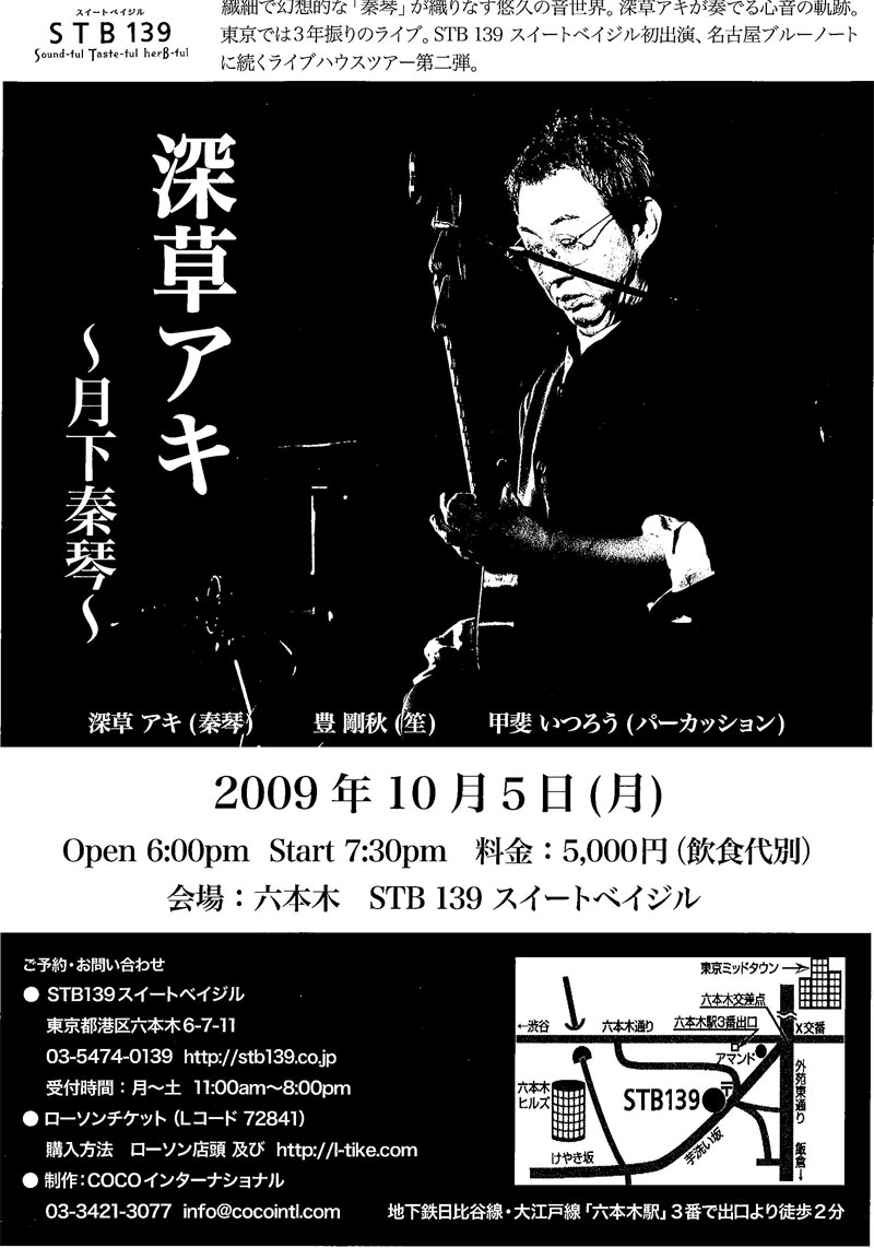 久しぶりに東京で「月下秦琴」と題して、本格的なライブをします。場所は六本木の「STB139 スイートベイジル」です。「名古屋ブルーノート」ライブに続いてのライブハウスコンサートです。メンバーは名古屋と同じ、パーカッション・甲斐いつろう氏、笙・豊(ぶんの)剛秋氏です。ライブハウスコンサートはホールコンサートと違い即興的な要素が多いので私にとってはのびのびと演奏できます。是非皆さん、今の私の音を聞きに来て下さい。美味しい食事もできます。