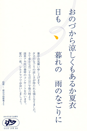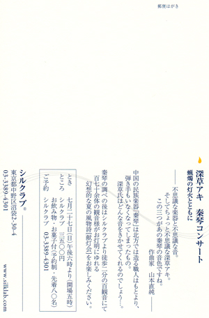 もう一つは 久しぶりに東京で開くコンサートです。7月27日(日)に沼袋のシルクラブで演奏します。ここも私一人のソロコンサートです。詳しいことはスケジュールを見て下さい。夏の夜の一時、静かな、不思議なコンサートにしたいと考えています。今回、本当に久しぶりで、東京では随分コンサートをしていませんでした。四谷コタンのライブは隔月にやってはいましたが、・・。 やはり音楽家足るもの、この東京で多くコンサートをしていないと忘れ去られてしまいますよね。本当に私は腰が重くてダメですね。ヨーシッ、これからはもっと東京で沢山コンサートをやろう!(まあ、希望的観測では在りますが。)とにかく今回は久しぶりなので皆さん是非おいで下さい。