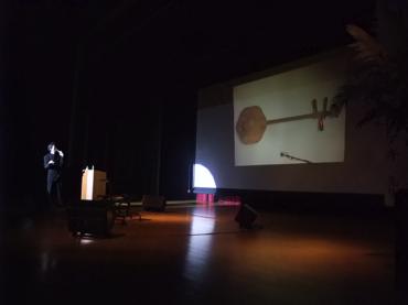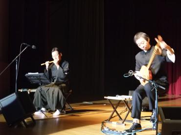 講演のあとは実際に「秦琴」の音を聞いてもらいました。始めに「沙羅の糸」を僕のソロで演奏しました。