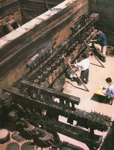 発掘された時の写真。紀元前五世紀ごろに存在していた「曽」の国の「乙」という侯の墓、すなわち「曽侯乙墓」です。