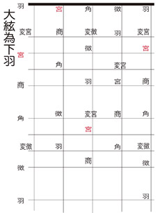 則ち加えられた絃は第四絃の“太簇の徴”の絃なのである。言うならば“林鐘均羽調式”のオープンチューニングの様なものである。(【図四】の場合では“南呂均”となるが。)