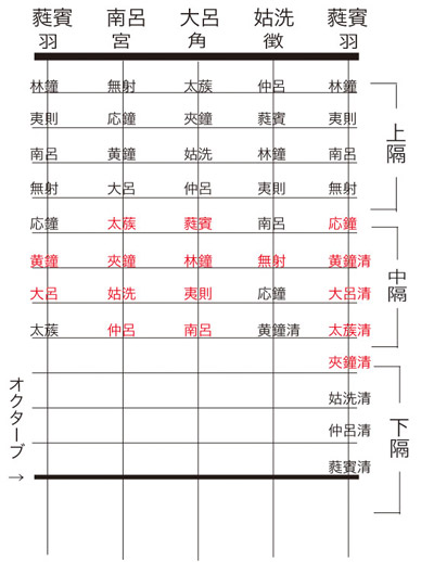 このように記されている。十二個ある柱を四つずつに分け、それを上隔、中隔、下隔としている。琴の下暉、中暉、上暉に類すると記されているが当然異なるものである。その中隔の四つの柱に第一絃から第五絃にかけて黄鐘から始まり太蔟清までの十五の律呂名が配置されている。勿論第一絃から弟五絃にかけて段々音が高くなってゆく。